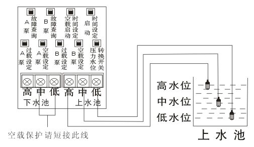 設(shè)置空載保護后,下水池不能接探頭。上水池的水用到中水位時會開始抽水,抽到高水位會水滿停機,低水位訊號線起回路作用。