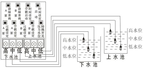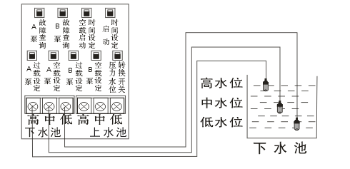 下水池用訊號線需跟廠家另行訂購,不能設(shè)置空載(即空載為000)。上水池的水用到中水位時會開始抽水,抽到高水位會水滿停機。下水池滿至高水位時會開始抽水,抽到中水位時會停機,即缺水保護。上、下水池之低水位訊號線都是起回路作用。