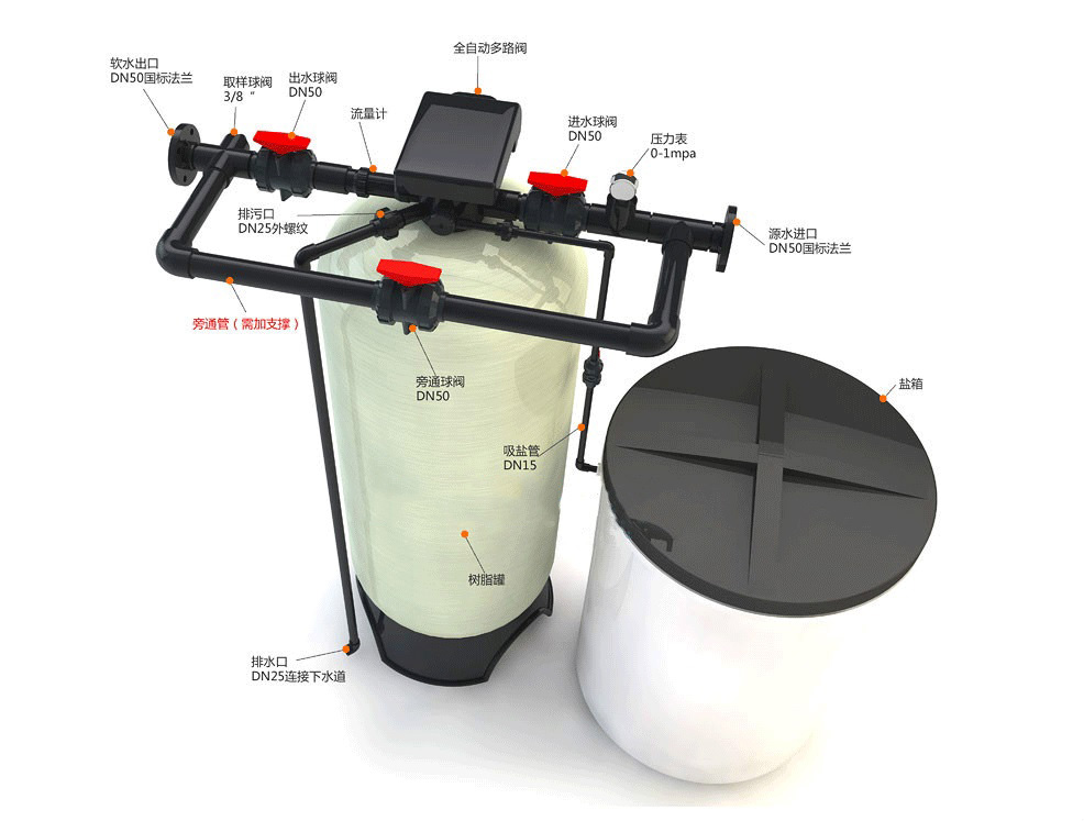 全自動(dòng)控制閥+玻璃鋼樹(shù)脂罐+交換樹(shù)脂+PE鹽桶