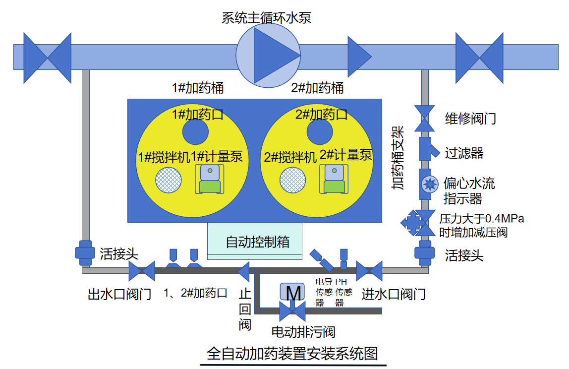 阻垢緩蝕劑投加單元:根據(jù)補(bǔ)水管道上的補(bǔ)水流量自動(dòng)控制加藥量,在保證效果的前提下,最大限度減少藥劑投加量。
